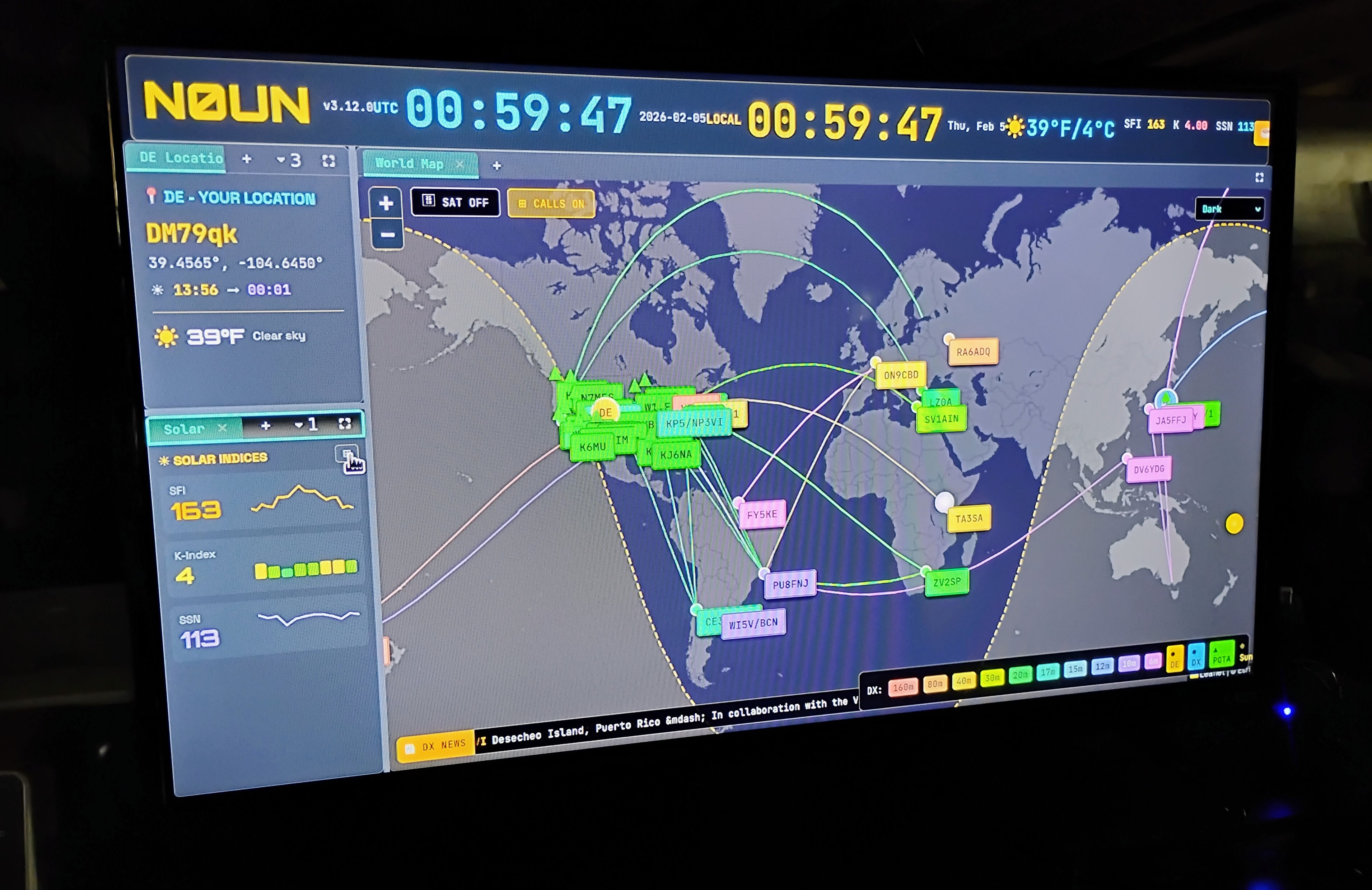 The settings I used: Your Callsign (N0UN), Your Callsign size (2), I set my Grid Square (DM79qk), then fine-tuned the exact coordinates to my main tower, set the Theme for (Dark), Layout to (Dockable), Timezone to (UTC), DX Cluster Source to (DX Spider Proxy), Language (English) and saved my settings. Your settings are saved in your Browser so when you go to the main site OpenHamClock.com from your browser you’re all set – everything is just as you left it. Don’t forget to bookmark OpenHamClock.com to make it easy for yourself!